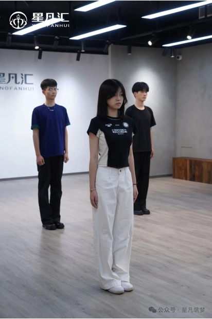 踏入服表班教室,明亮的镜面T台在聚光灯下熠熠生辉,两侧落地镜延伸出无限空间感,专业级走秀音响与氛围灯带,营造出沉浸式时尚秀场氛围。