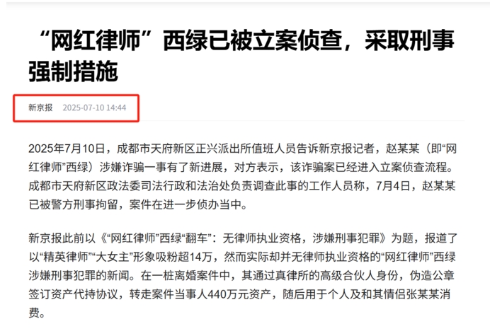 近期,拥有14万粉丝的成都 “网红律师”西绿赵某假身份一事,引发广泛关注。消息称,这名打造“精英女律师”人设的网络红人,实际上并无律师执业资格。
